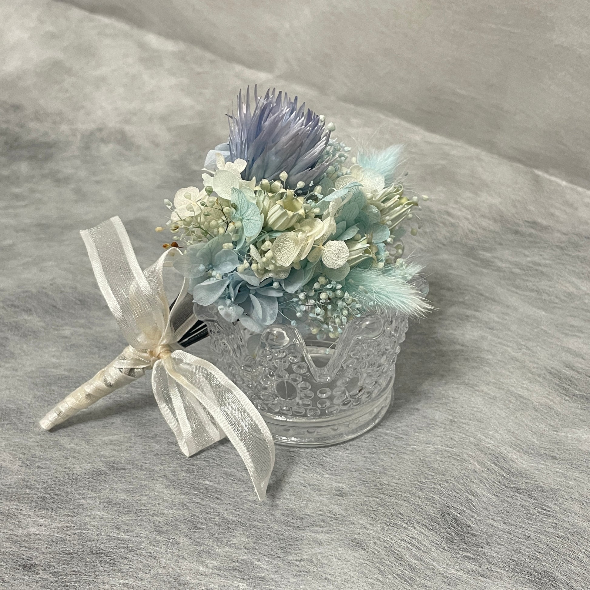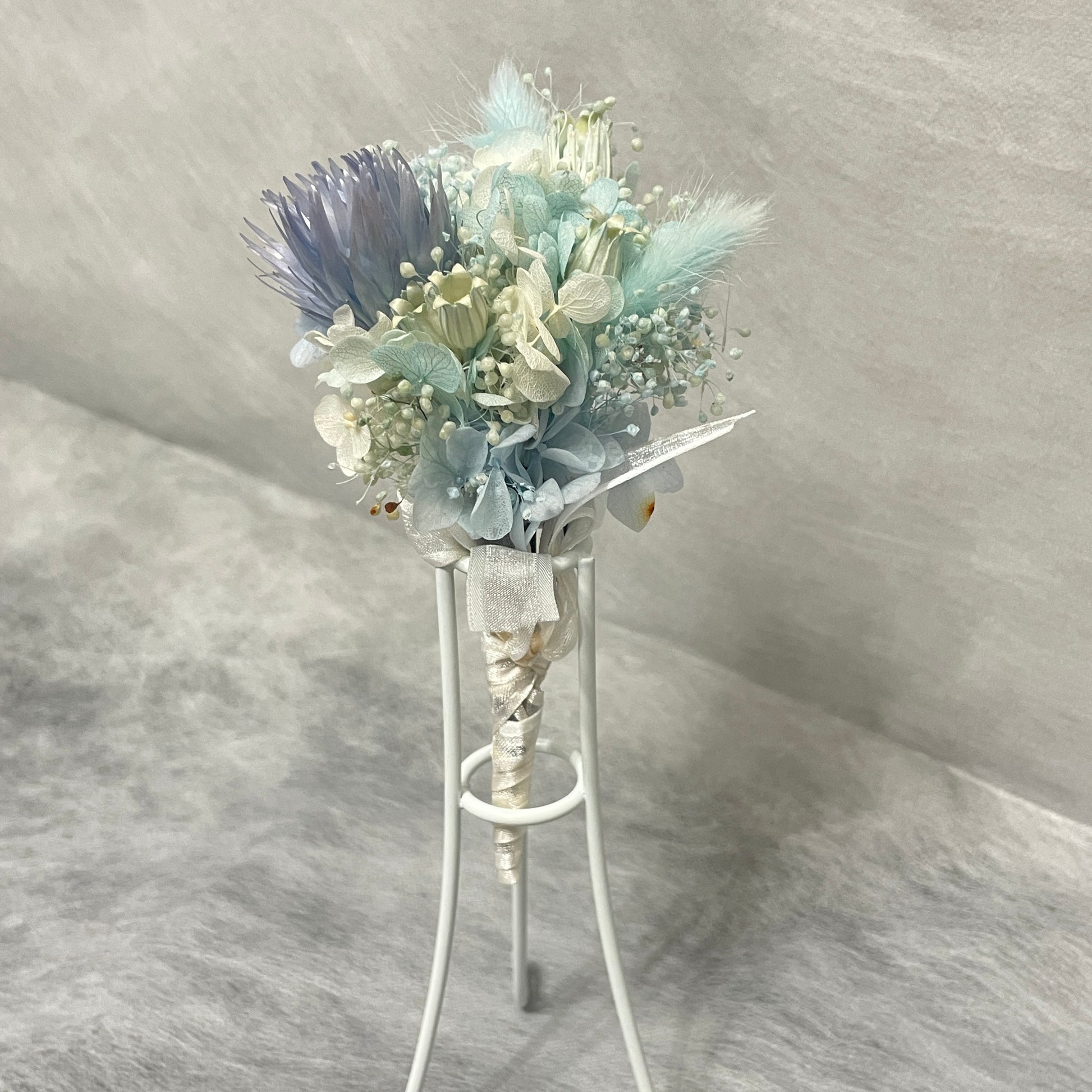 ・花材:ブルーデージー/ラグラス/カスミソウなど